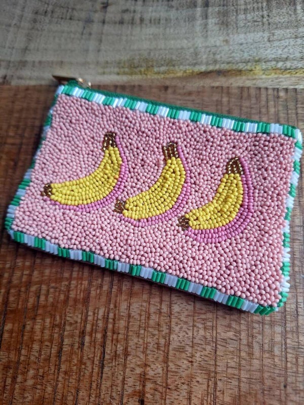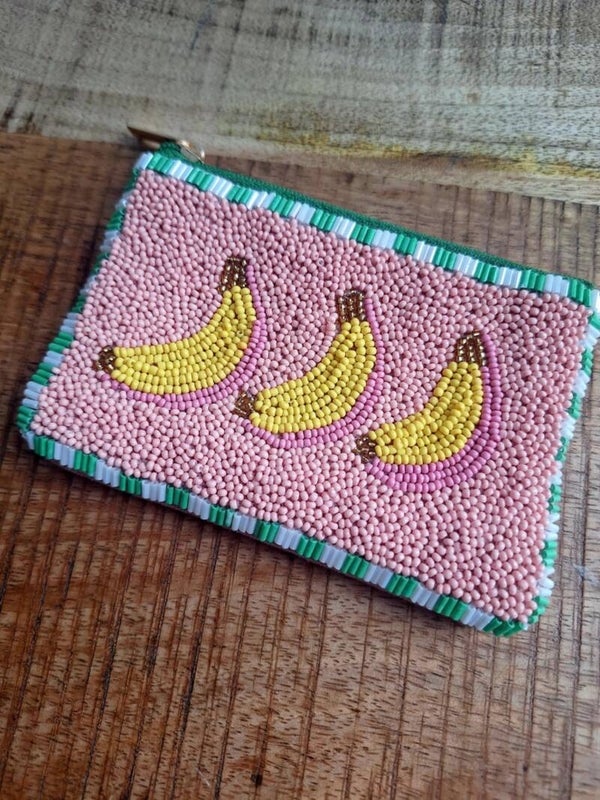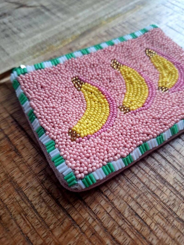 Handgemaakt stoffen portemonneetje met kraaltjes met banaan design.