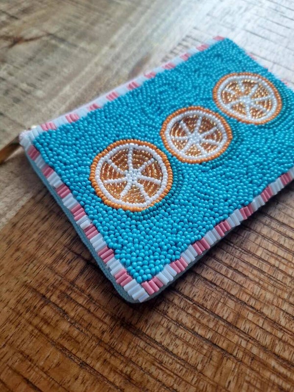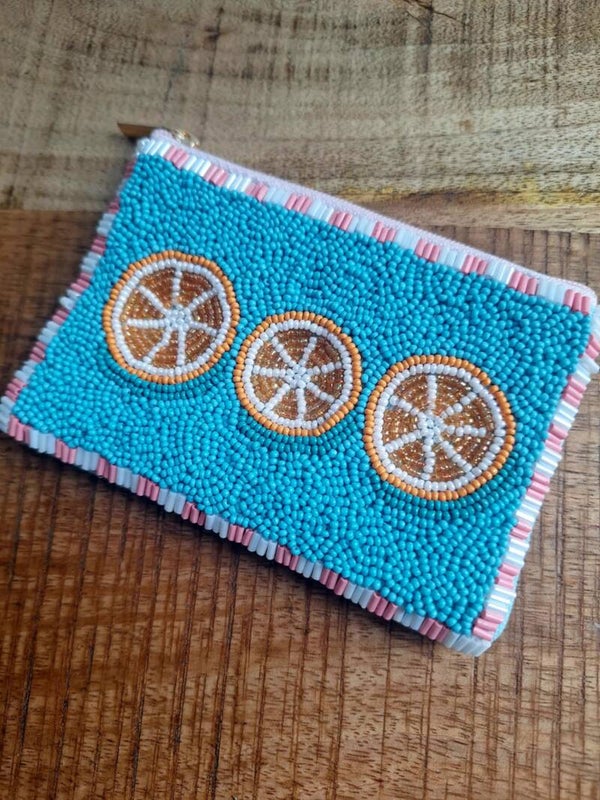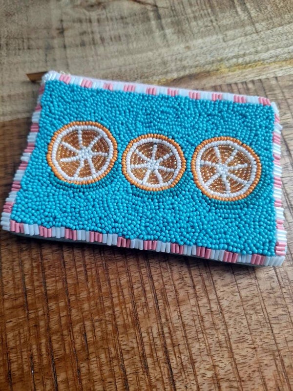 Handgemaakt stoffen portemonneetje met kraaltjes met appelsien design.