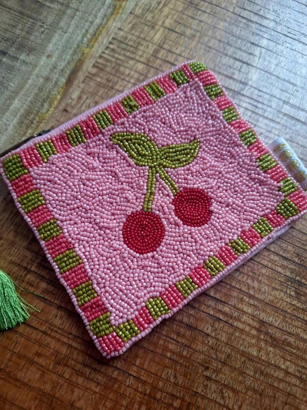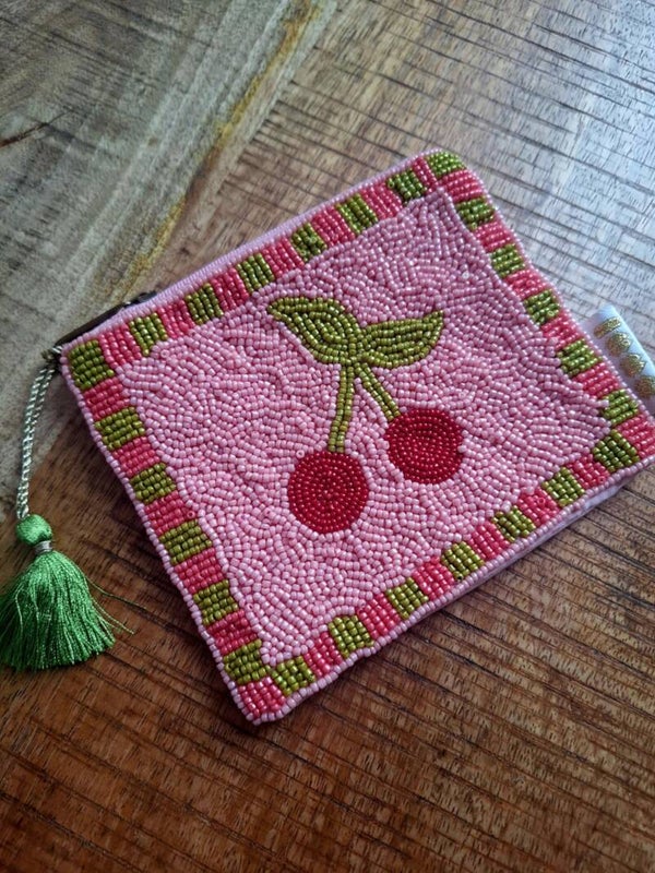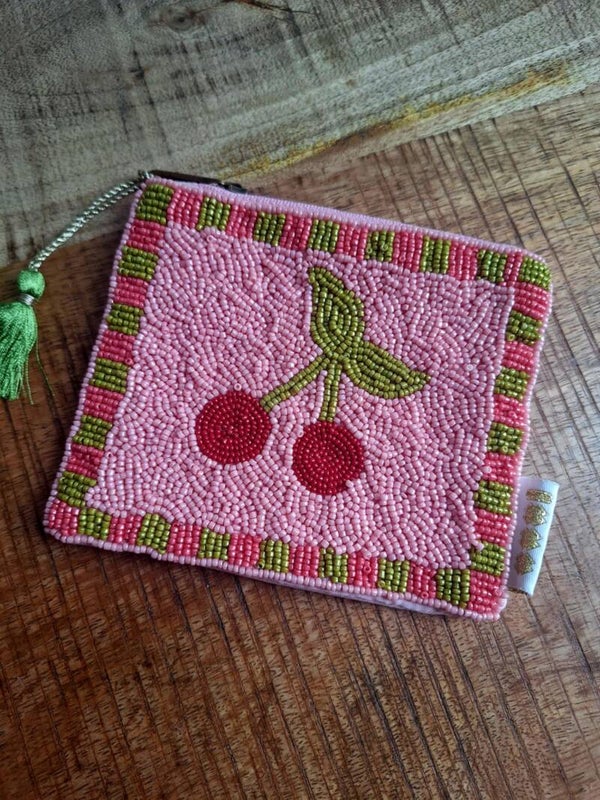 Handgemaakt stoffen portemonneetje met kraaltjes met kers design.