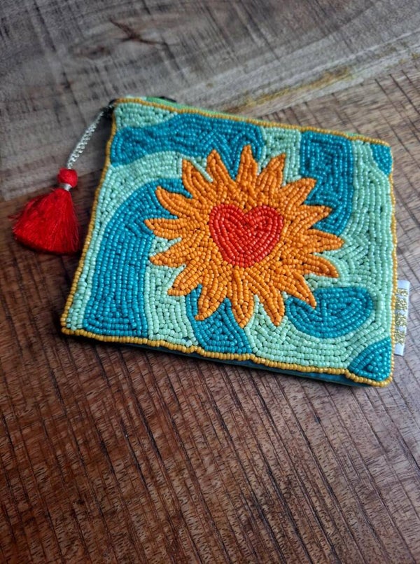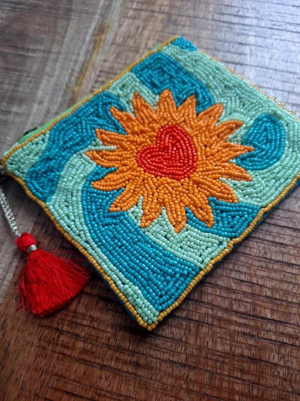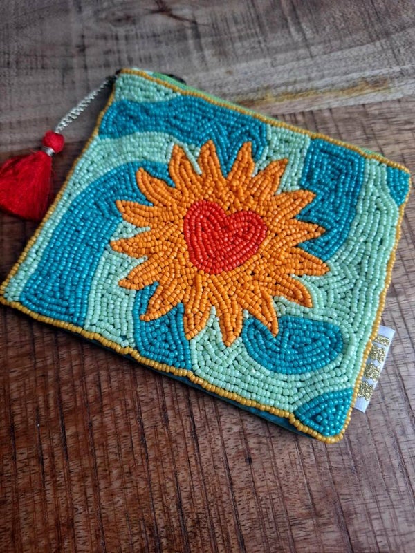 Handgemaakt stoffen portemonneetje met kraaltjes met zon/hart design.