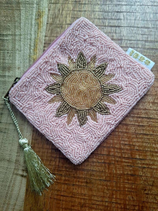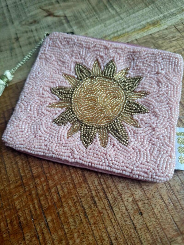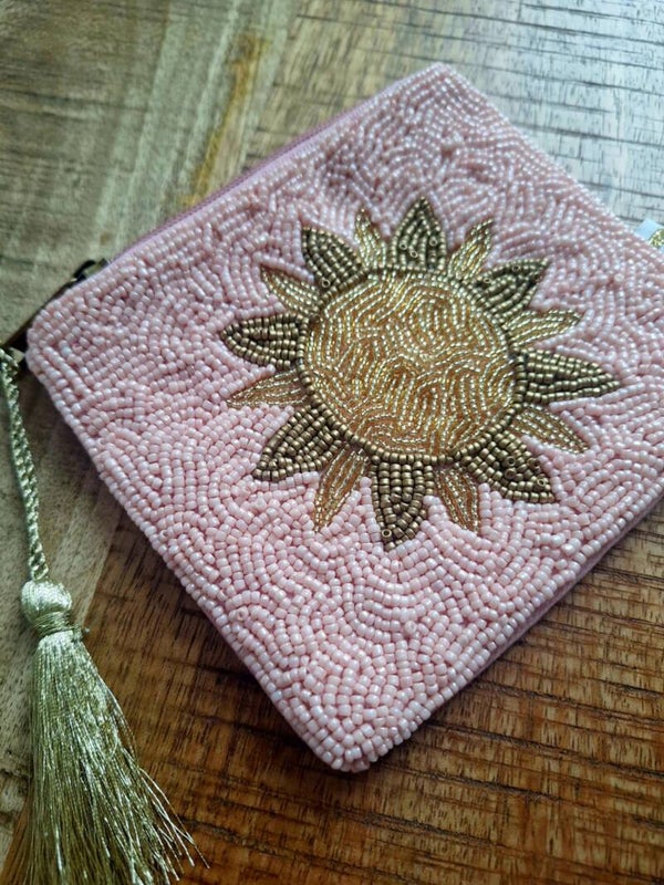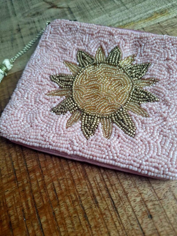 Handgemaakt stoffen portemonneetje met kraaltjes met gouden zon design.