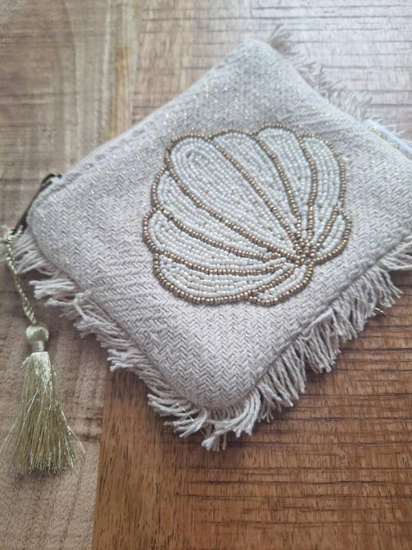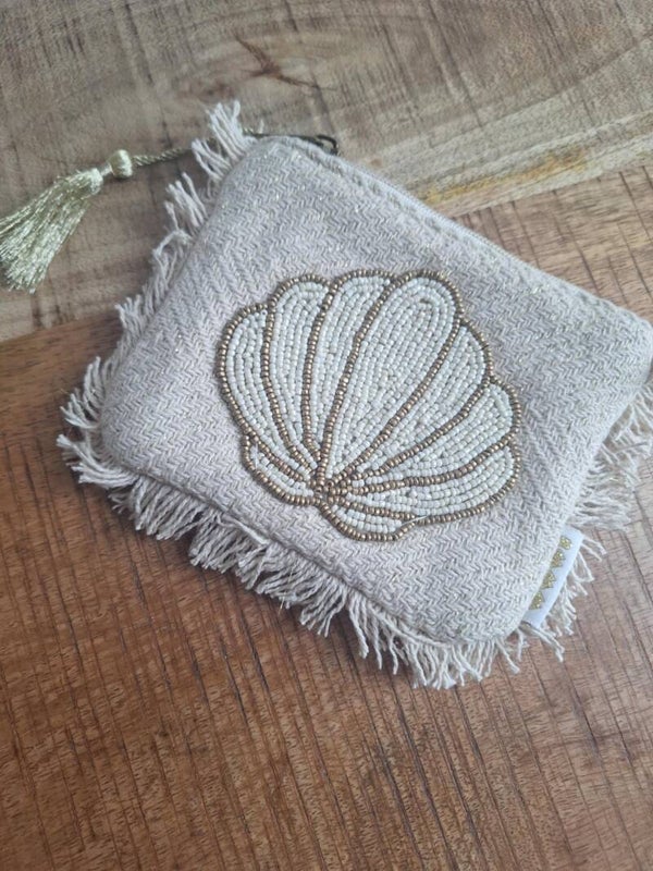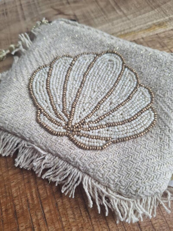 Handgemaakt stoffen portemonneetje met kraaltjes met schelp design.